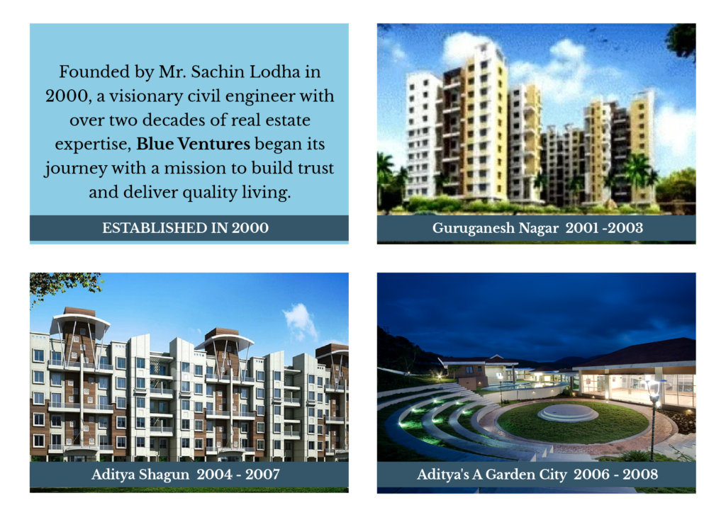 Sachin S. Lodha began working independently and collaborated with renowned real estate brands such as Aditya Builders, Xrbia, Saarthi Group, and SVB, among others. He played a pivotal role in the successful execution of numerous projects for these esteemed organizations. Driven by a larger vision, he took a significant step toward his dream by founding Blue Ventures, with the mission of providing exceptional quality living experiences for homebuyers.